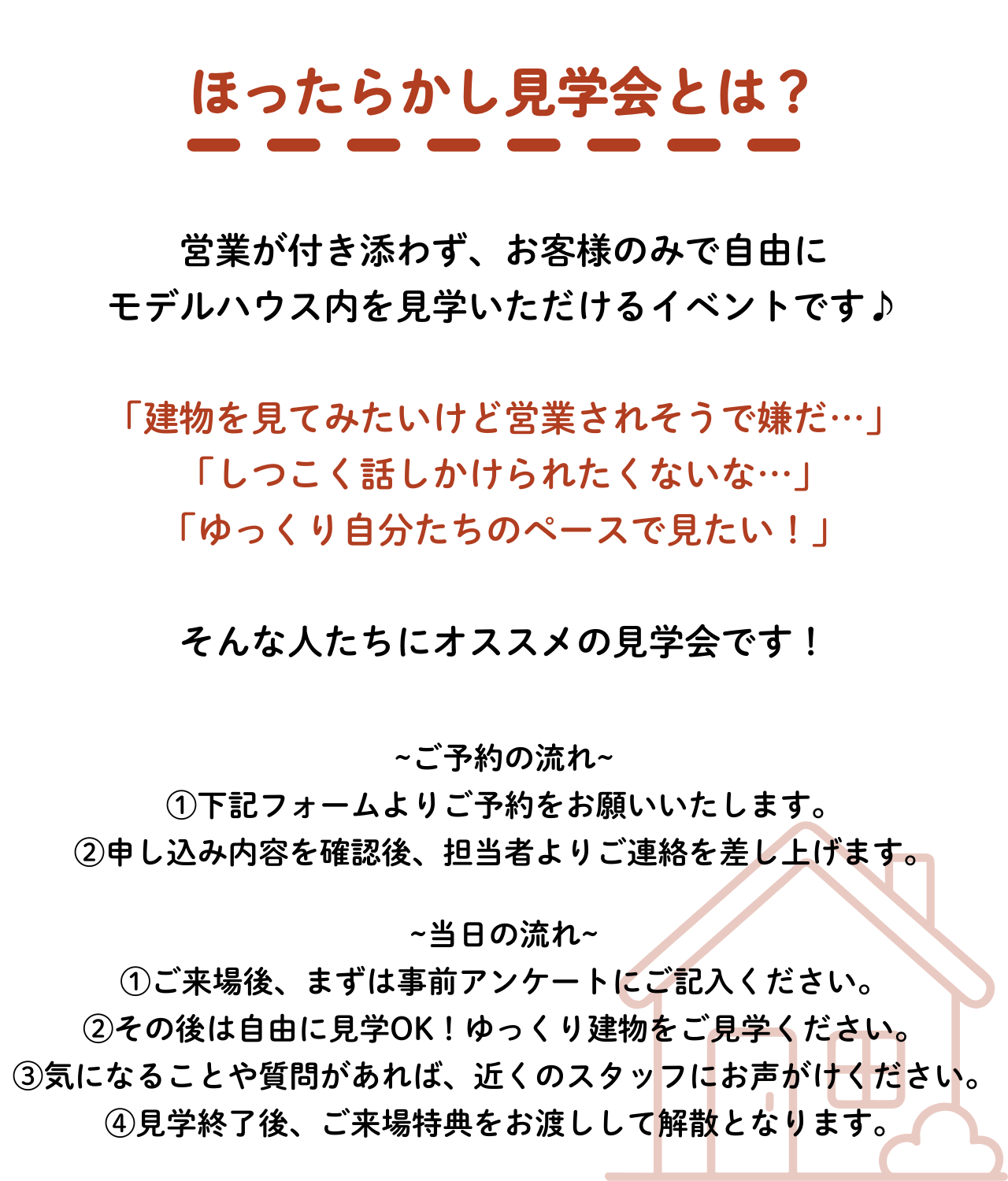 | 備考 | ※イベント予約フォームの「ご質問・ご相談等」の欄に、見学希望するモデルハウスの名前を入力してください。1~3棟まで見学OKです! |