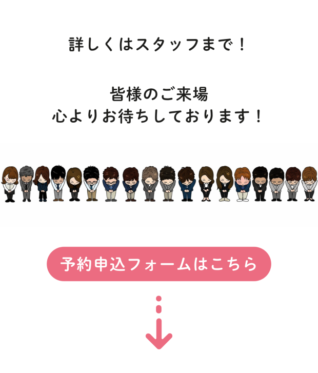 ※ご予約無しでもご来店頂けますが、担当者が不在の場合がございますので、予めご了承ください。