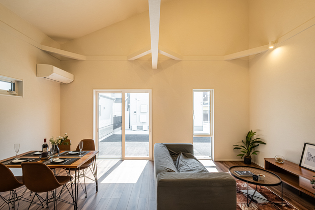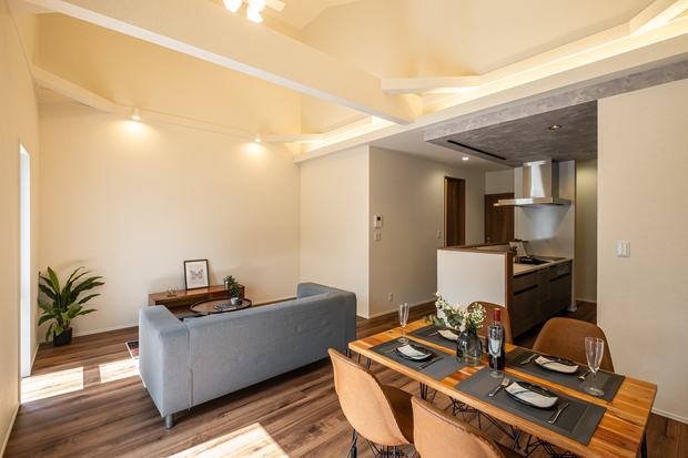 勾配天井にした大空間の20帖LDK。ヴィンテージテイストのかっこいい内装デザインを採用しました!