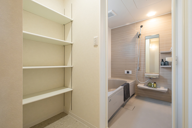 お風呂横の脱衣室には可動棚を取り付けて着替えやタオルなどを置けるように工夫しました♪