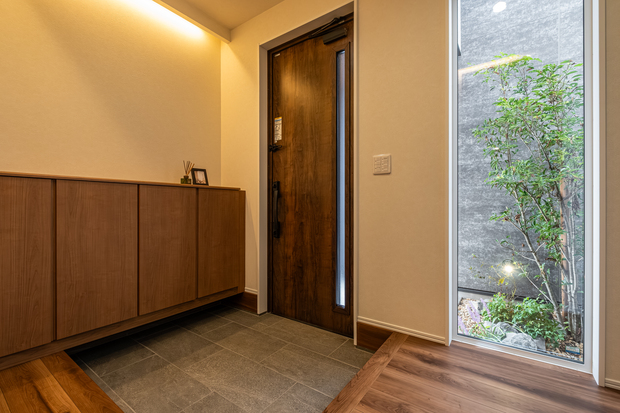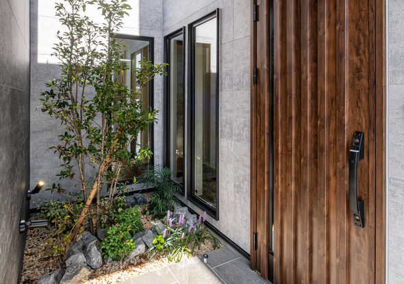 玄関横に大きなFIX窓を設け、中庭のシンボルツリーが見えるよう設計しました。