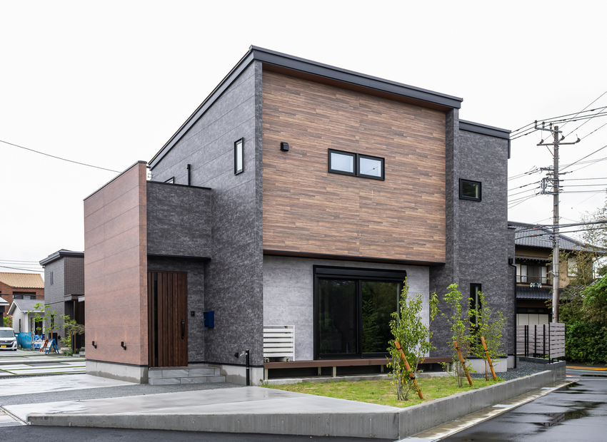 住宅街の角地、南面が開けた好立地に新築したN邸。スタイリッシュでかっこいい外観とブルックリンテイストの室内がすてき。LDK内に書斎とファミリークローゼットを設けたり、サウナを搭載したり、おうち時間をより快適に過ごせる居住空間を実現した。『いろはこ』だからこそ、耐震等級3、高気密・高断熱性能を備えながらも建築価格をぐっと抑えて建てることができたとNさんご夫妻は喜んでいる。