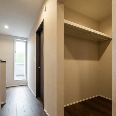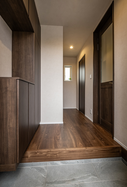 コンクリート調と木目調のサイディングが美しく融合した外観は、セルフクリーニングで40年間塗り替え不要の光セラを使用(標準仕様)。南面に遮る建物が何もないアドバンテージを活かして、ワイドスパンのタイルデッキと庭を設け、自然を身近に感じる暮らしを楽しんでいる。玄関ホールを入り、手前のドアを開けるとリビングへ、奥のドアを開けるとファミリークローゼット、書斎、LDKへとつながる。