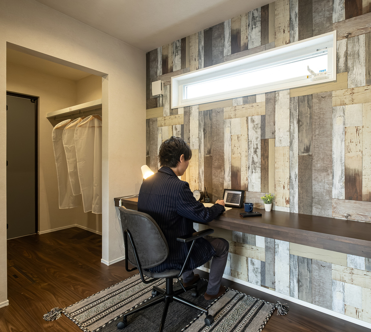 ご夫婦が好きなブルックリンテイストでコーディネートしたLDK。デザインと機能性が人気の対面キッチンはTakara standardで、フローリングの色と質感に合わせてセレクトした。リビングに隣接する書斎は3畳で、その奥にウォークルーのファミリークローゼットがある。慌ただしい朝の支度もラクラク♪