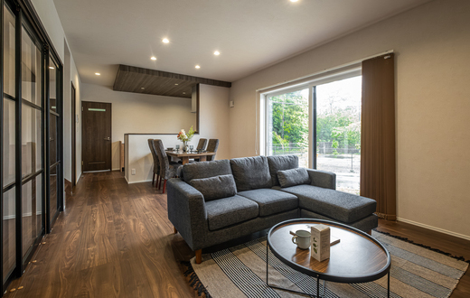 18畳のLDKは一般住宅の天井よりも15cm高い2,550mmで、実面積よりも広く感じられる。ご主人のリモートワーク用にしつらえた書斎は、透明のガラス戸を採用し、リビングとシームレスにつながっている。リビングの南側に大開口を設け、十分な光と風を取り込めるように設計した。