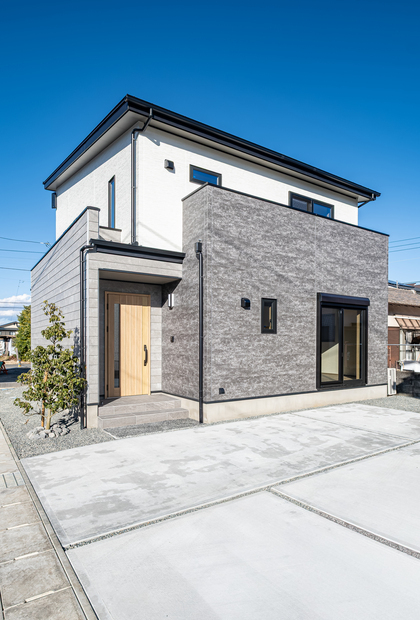伊豆箱根鉄道韮山駅から徒歩2分。自然に恵まれた伊豆の国市四日町の分譲地に誕生したモデルハウス。3~4人家族が無理なく、快適に暮らすには“ちょうどいい”サイズの家と言える。外観は2種類のサイディングと、おしゃれな質感のSOLIDOを組み合わせたシンプルモダンな仕上がりに。長く住んでも飽きのこないデザインが魅力だ。