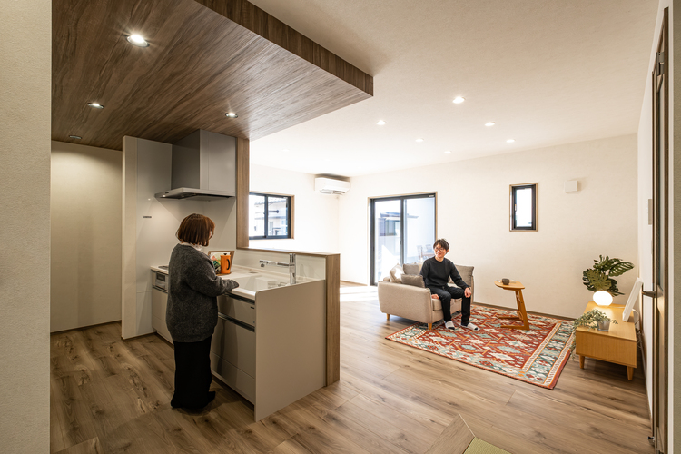 1階のLDKは、つながりを持たせながら緩やかにゾーニングされ、ゆったりとくつろぐことができる。キッチンから目が届く場所にしつらえた小上がりの畳コーナーは、ゴロンと横になったり、洗濯物をたたんだり、お子さんをお昼寝させたり、さまざまな用途にも使える。また、キッチンのバックヤードに水回り機能を集約させたことで家事時間短縮につながり、家族団らんの時間が増える。2階は、主寝室、2つの子ども部屋と大容量のウォークインクローゼットを設けた。無駄な廊下を省くことで、延床面積30坪とは思えないほど各居室を広めに確保することができた。