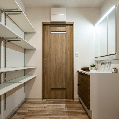 デザインと機能性を両立した洗面脱衣室。造作の可動棚も便利。外から帰ってきてママの顔を見てから2階に上がるリビング階段も
