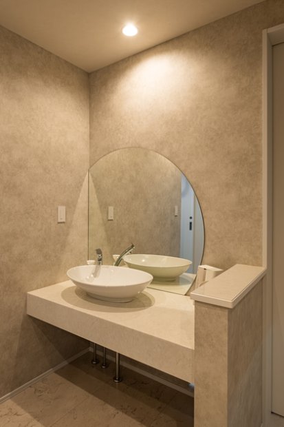 玄関に入ってすぐのところに造作の洗面を設置した。円いミラーがアクセントに