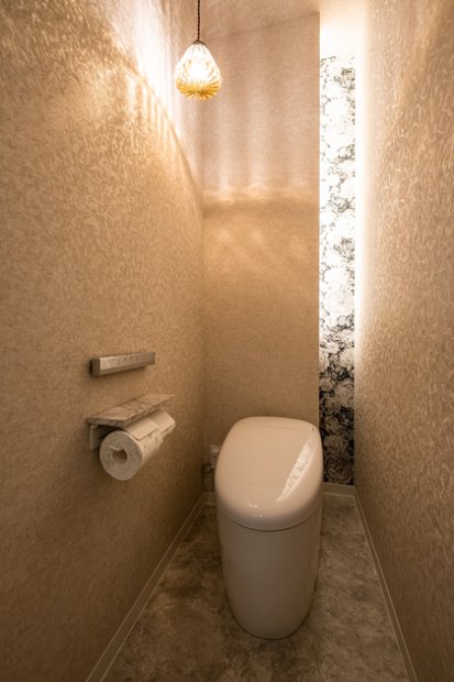 猫が自由に行き来できるよう、室内の随所に猫穴を設けた。トイレもスタイリッシュに。奥の壁の裏にトイレットペーパーを収納できる