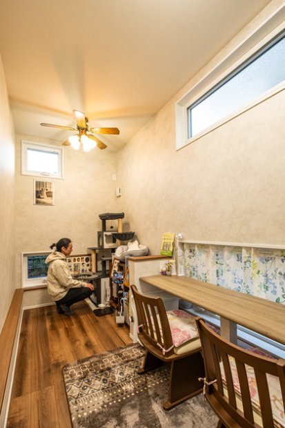 子世帯が暮らす2階のLDKはホテルライクなテイストでコーディネート。フローリングと壁、天井をグレージュで統一し、無垢の梁を見せるために吹き抜けを採用して開放感を出しました。また、主寝室をコンパクトに抑えたことにより、ご夫婦で毎日ゲームを楽しむ部屋を確保することができました。さらに、3匹の猫ちゃんたちもストレスフリーで過ごせるよう、1階と2階の随所に猫穴を設け、自由に行き来できるようになっています。
